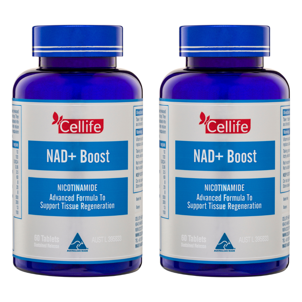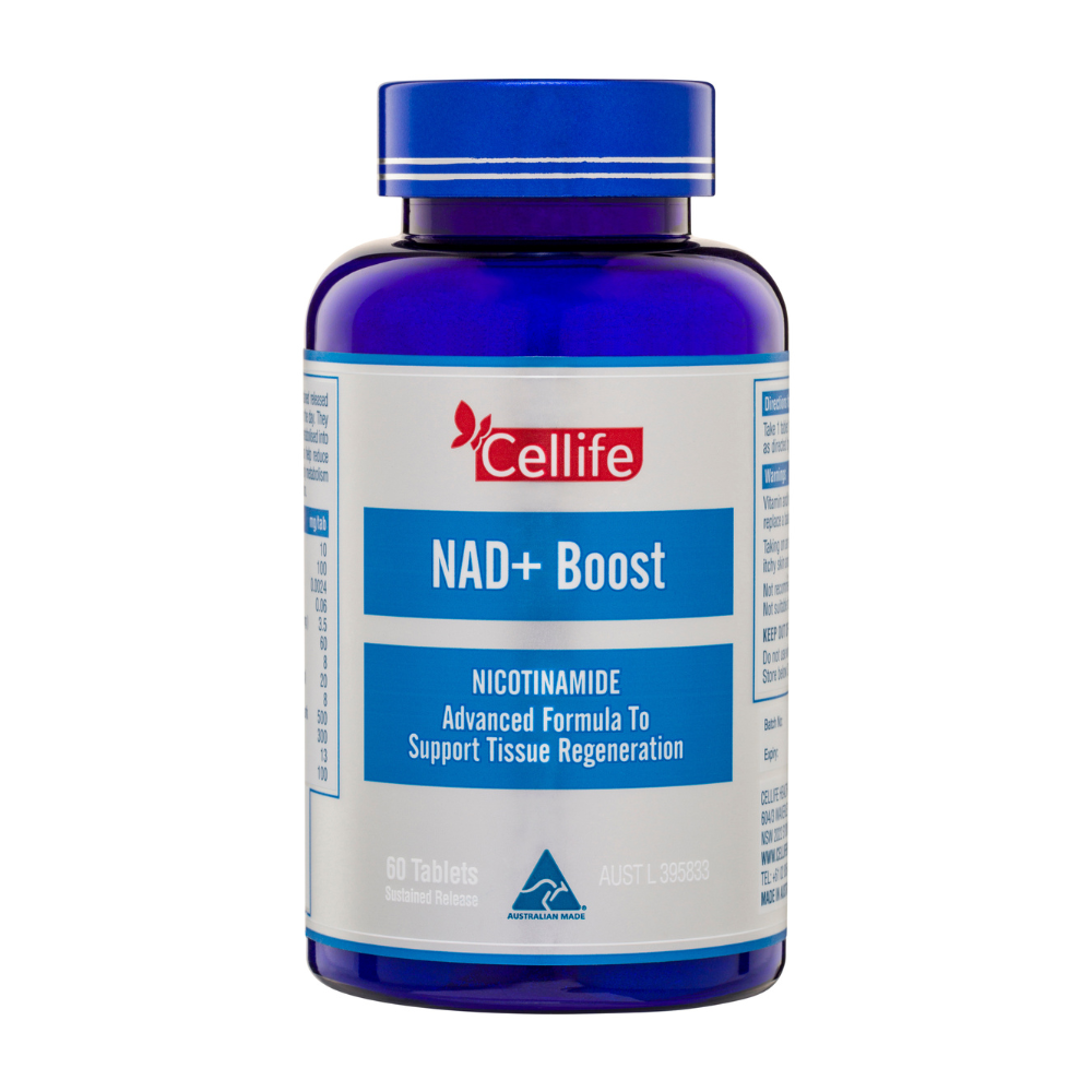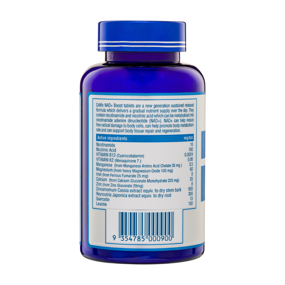 Cellife NAD + Boost, is a sustained release complex containing Nicotinic acid and Nicotinamide. These nutrients are precursors to NAD+ which plays an essential role in energy metabolism and DNA repair.