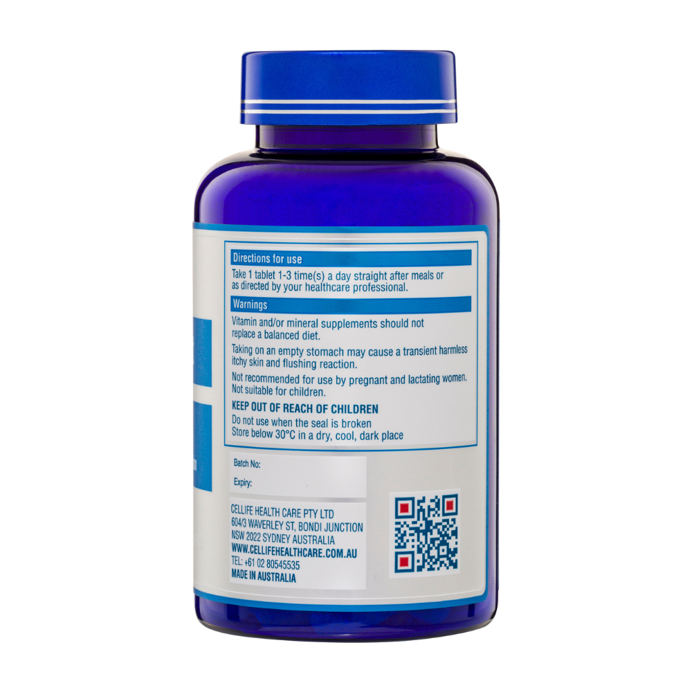 Warnings Always read the label. Strictly adhere to dosage guidelines - avoid excess consumption. Use with caution when in conjunction with reduced calorie diet and increased physical activity. Vitamins and minerals can only be of assistance if dietary intake is inadequate. Vitamin and mineral supplements should not replace a balanced diet. Store below 25℃ in a dry, cool, dark place. Keep away from heat and direct sunlight. Protect from humidity. Keep out of reach of children. Do not use if bottle cap or tamper proof seal is broken.