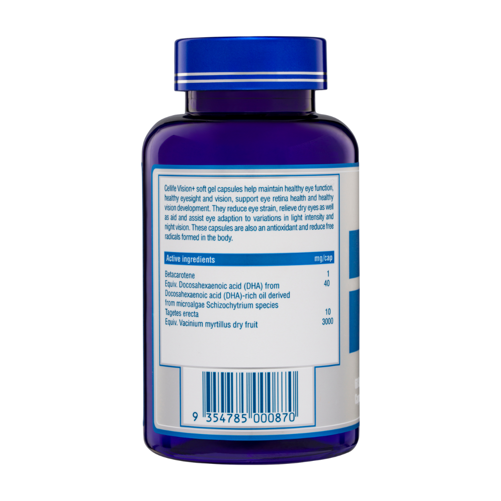 Cellife Vision+ soft gel capsules help maintain healthy eyesight vision and function, also supporting eye retina health and vision development. Vision+ also helps to relieve dry eyes and reduce eye strains, while assisting with better adaptations to light variations and night vision. It is also rich in antioxidants, helping to reduce free radicals that are formed by the body.